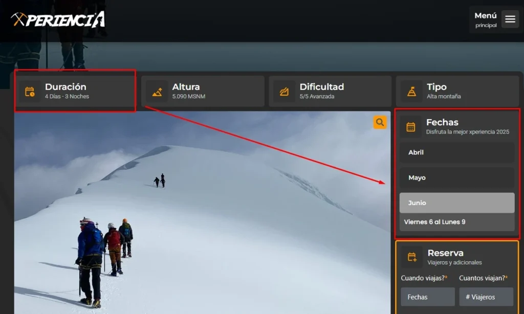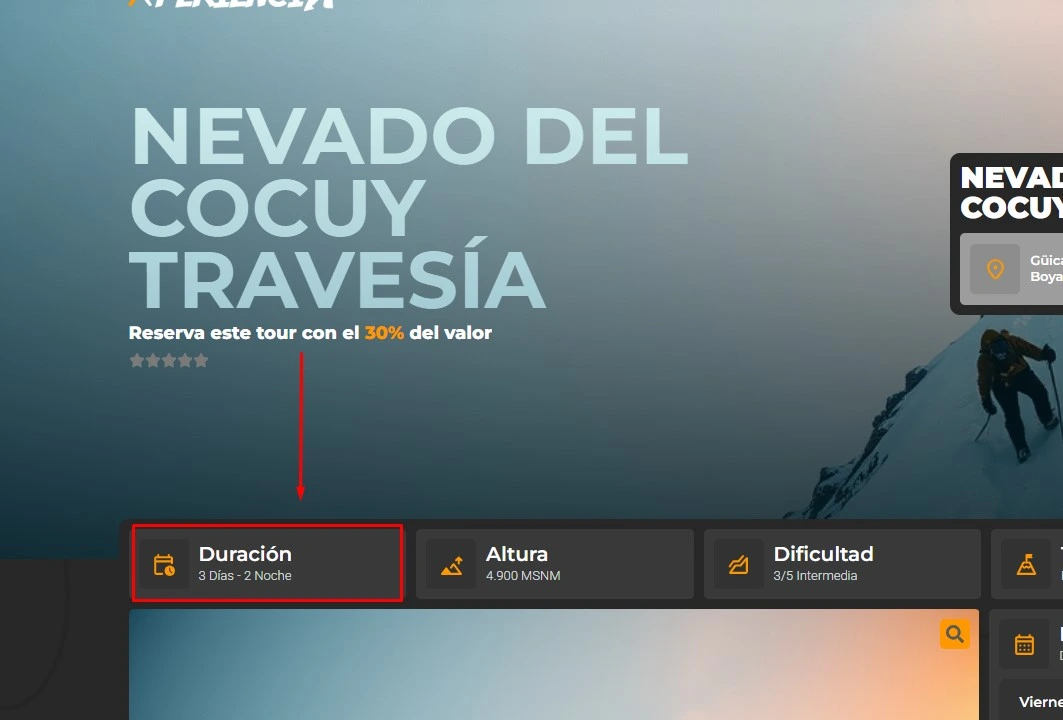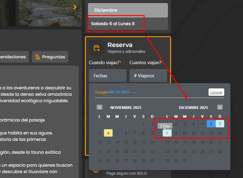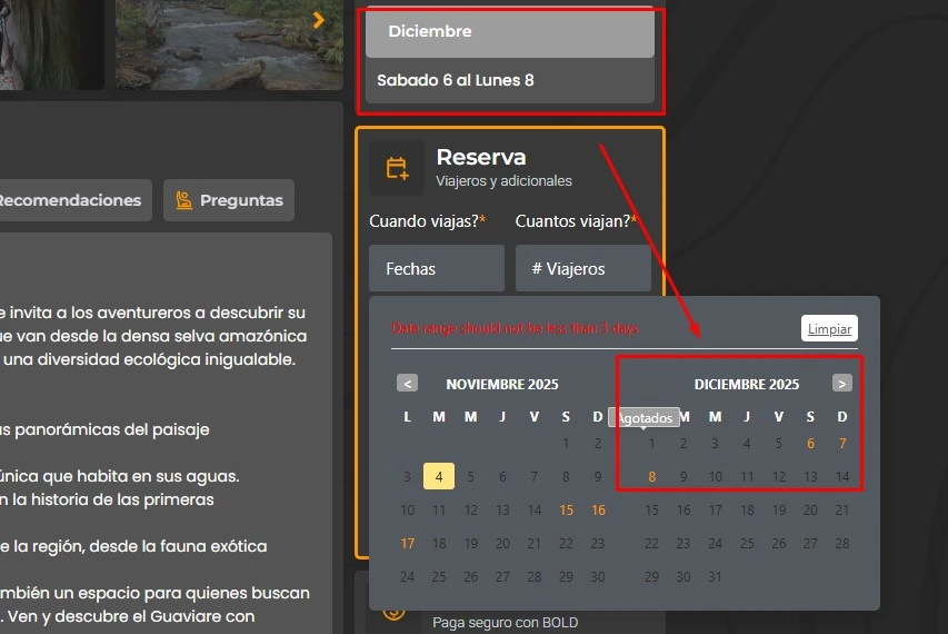 3.1 Lo primero es buscar la fecha disponible en el calendario, los días agotados aparecen en gris oscuro cuando seleccionas te saldrá una nube que lo dice, y los días disponibles en naranja.